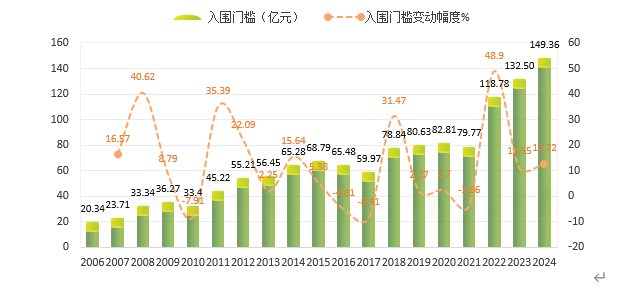 2006-2024制造业百强入围门槛及变动幅度(%)