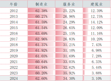 另外,虽然近年来浙江省三产占GDP比重已经超过二产,2024省百强企业中制造业企业仍有68家,比上年增加5家,营业收入达66264.14亿元,比上年60219.64亿元增长10.04%,占百强收入总额的62.60%,由此可见制造业仍是浙江经济发展的重要支柱。