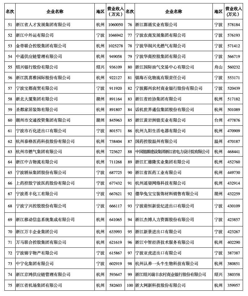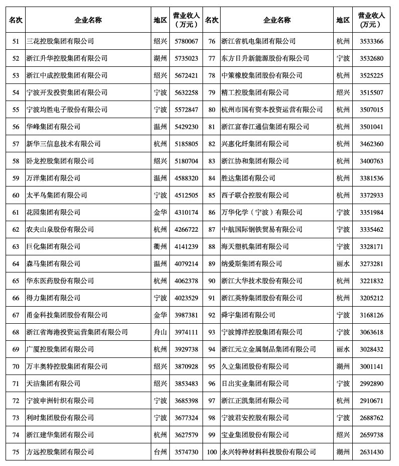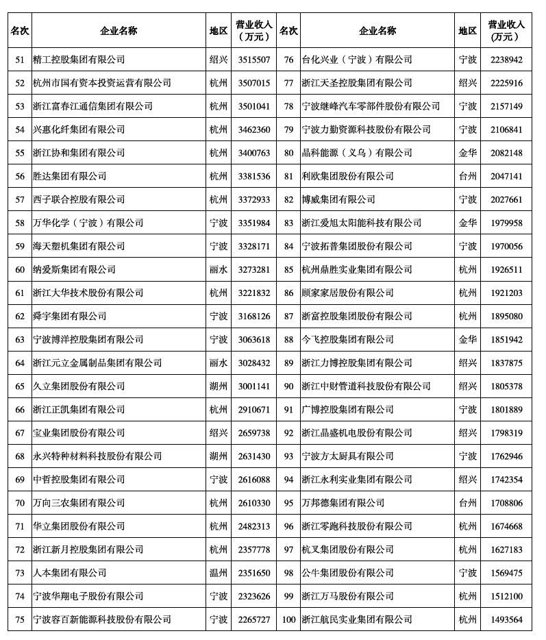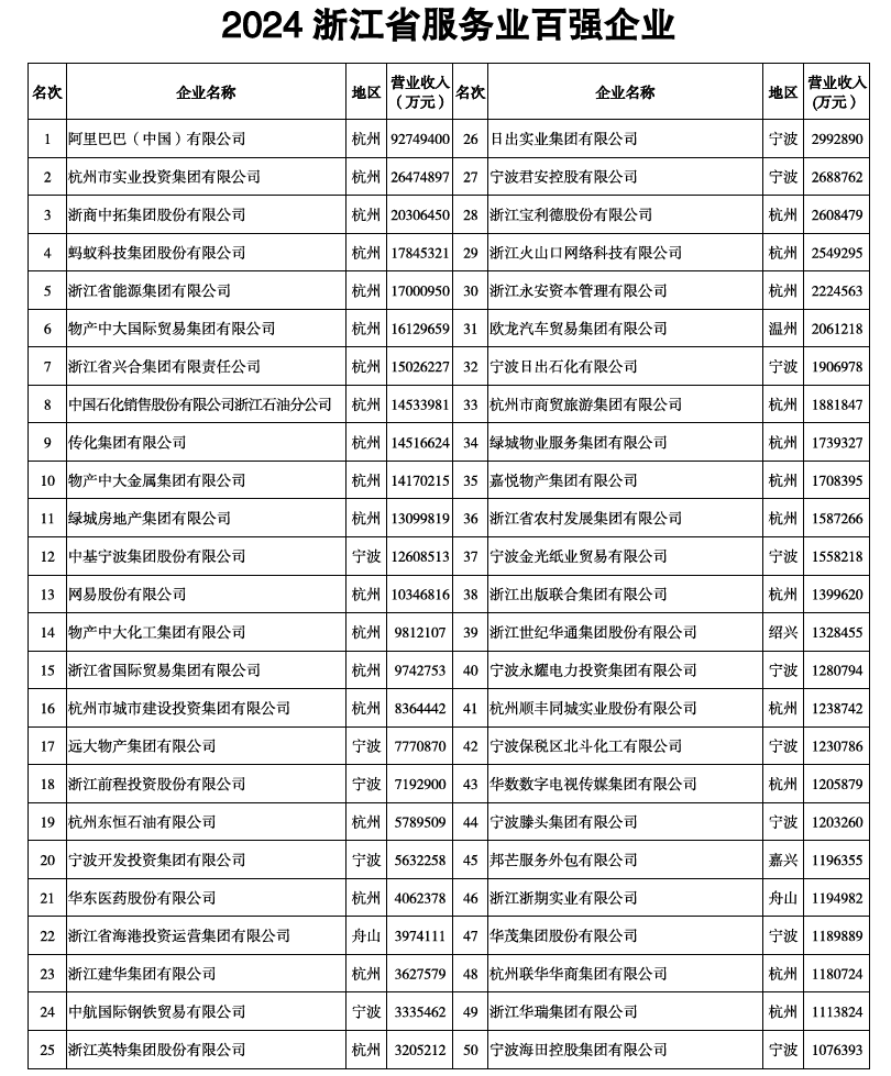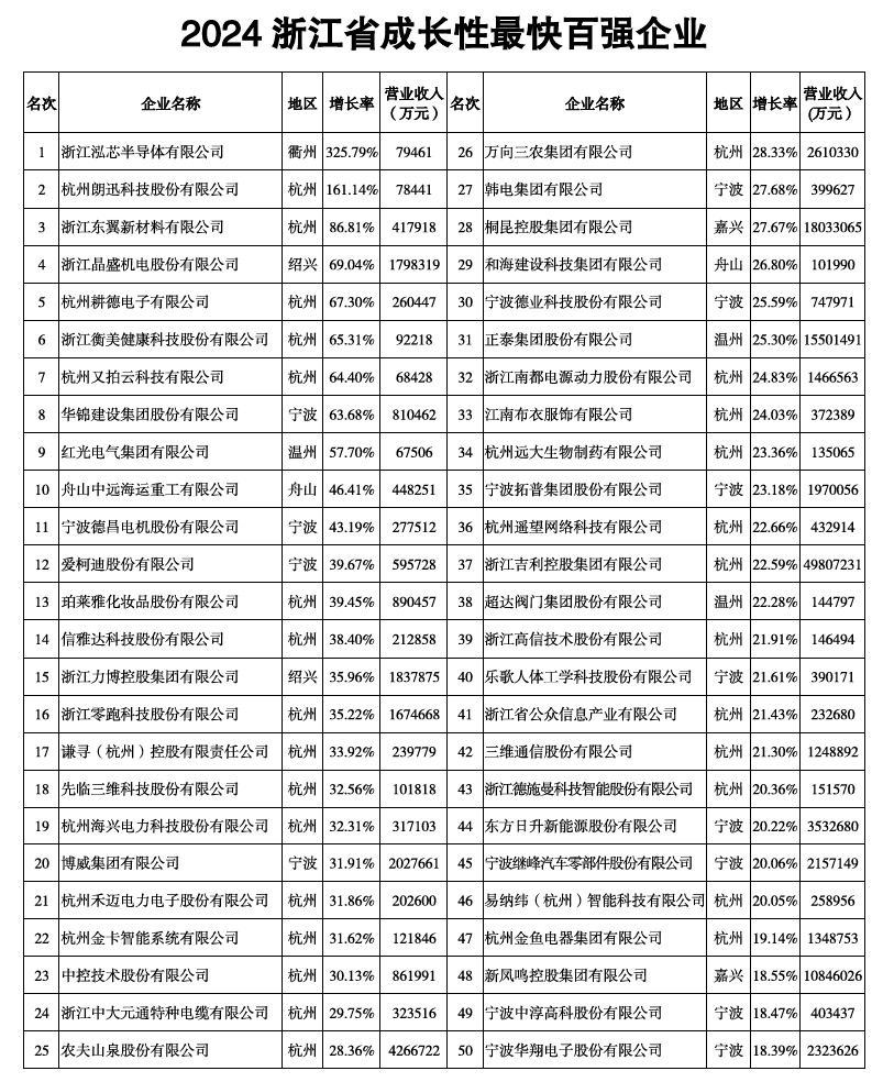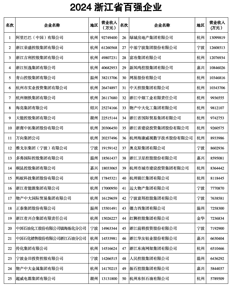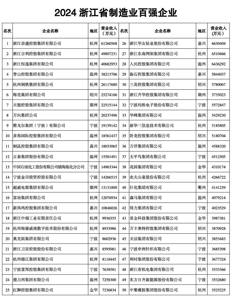 近日,浙江省企业联合会、浙江省企业家协会、浙江省工业经济联合会正式发布2024浙江省百强企业榜单,其中包括《2024浙江省百强企业》《2024浙江省制造业百强企业》《2024浙江省服务业百强企业》《2024浙江省成长性最快百强企业》榜单。