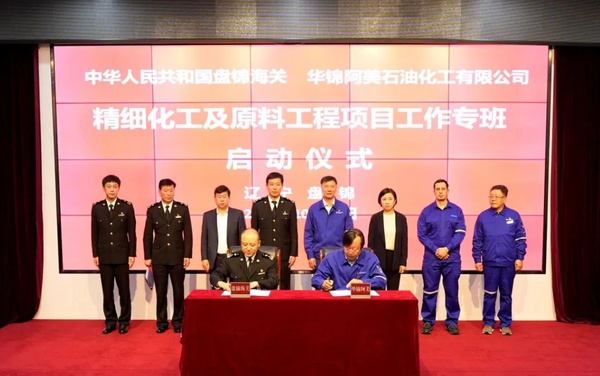 10月17日,华锦阿美石油化工有限公司与盘锦海关联合举办精细化工及原料工程项目工作专班启动仪式,双方就深化关企合作进行深入交流并签订了专项工作方案。公司总裁金晓晨、首席财务官毛琦、副总裁杨德俊与盘锦海关领导参加仪式。