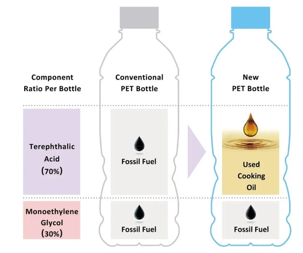 PET树脂是PET瓶的原材料,由30%的单乙二醇(MEG)和70%的对苯二甲酸(TPA)组成。自2013年以来,三得利集团已在其天然水品牌PET瓶中使用植物来源的MEG。在这一新挑战中,该集团成功地以废弃食用油为原料,在商业规模上生产TPA。