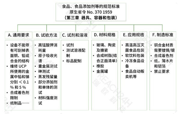 日本《食品卫生法》是对食品接触材料监管的基础框架法规。为了配合该法规的实施,厚生劳动省颁布了《食品、食品添加剂等的规范标准》,其中“第三章 器具、容器和包装”对食品接触材料做出了具体的规定和管理,包括通用要求、试验方法和试剂、材料规格、制造等,其原有的结构如下图所示。