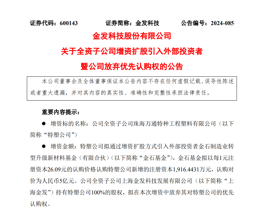近日,金发科技发布公告,公司全资子公司珠海万通特种工程塑料有限公司(以下简称“特塑公司”)拟通过增资扩股方式引入外部投资者金石制造业转型升级新材料基金,认购对价人民币5亿元。