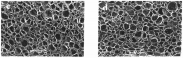 在没有加入SEBS的发泡体系中,泡孔小,泡孔密度也小,而且分布也不均匀,泡孔生长也不充分。而随着SEBS加入量的增加,泡孔变大,生长更充分,分布也更为均匀,相邻泡孔间挤压为不规则形状。