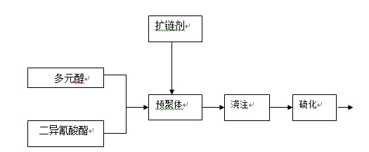 反应过程:多元醇与二异氰酸酯反应,制成低分子量的预聚体;经扩链反应,生成高分子量聚合物;然后添加适当的交联剂,生成聚氨酯弹性体。其工艺流程如下: