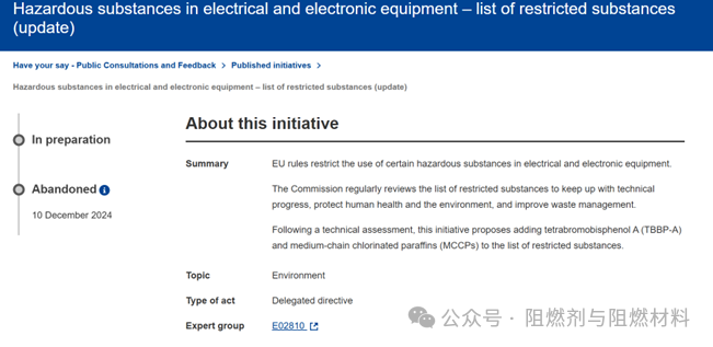 2024年12月10日,欧盟委员会在其立法公共征询平台“您的意见” (Have Your Say)上宣布,放弃将四溴双酚A(TBBPA)纳入RoHS限制物质清单的立法提案。在过去4年里,四溴双酚A是否增列欧盟RoHS一直为业内人士广泛关注,现在终于有了定论。提案的来龙去脉 2018年,欧盟委员会启动RoHS指令评估项目Pack15,聘请有关咨询机构对包括四溴双酚A在内的7项物质进行评估,以决定是否将其纳入RoHS指令附件II限制物质清单。2021年,欧盟委员会发布该咨询机构的最终评估报告,报告对四溴双酚A反应型应用(例如在印刷电路板中)的建议是“无限制”,但建议限制TBBPA的添加型应用。同时,欧盟委员会并没有完全采纳该咨询机构的建议,准备视REACH对四溴双酚A的评估结果决定是否限制它的添加型应用。2022年,欧盟委员会也是在其立法公共征询平台“您的意见”上提出将四溴双酚A增列RoHS的提案,但不久就暂停该提案。2024年,欧盟放弃该提案,结束了长期的争议。