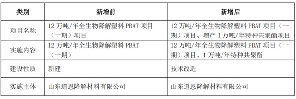 公告进一步指出,为了更好的利用 PBAT 项目装置,道恩股份使用自有资金对 12 万吨/年全生物降解塑料PBAT 项目(一期)项目进行了技术改造,以使其同时可满足 PETG 等共聚酯产品的工业化生产,截至目前已具备生产条件。新增实施内容情况如下: