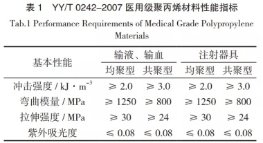 普通聚丙烯的卫生性能指标无法达到生产医用制品的标准,国内目前医用聚丙烯卫生性能方面的评价主要是按照YY/T 0242- -2007 《医用输液、输血、注射器具用聚丙烯专用料》进行检测。该标准除规定了医用聚丙烯的物理机械性能,还规定了其化学性能及耐辐射的技术指标。