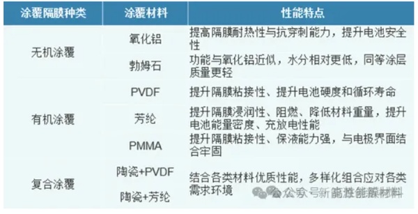 涂覆隔膜多为定制化产品,其多样性体现在涂覆浆料配方和涂布工艺的不同。由于下游电池厂商通常对隔膜性能有着差异化需求,隔膜供应商需要通过使用不同涂料、调整浆料的配比、涂布工艺等方式,制备出满足客户不同需求的涂覆隔膜。因此涂覆制浆和涂布工艺是涂覆隔膜生产的核心技术。涂覆产品按材料材质区分,主要包括无机涂覆、有机涂覆和复合涂覆等,其主要特点如下: