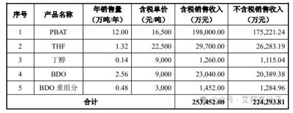 年产12万吨生物可降解新材料项目营业收入估算:本项目主要产品为PBAT,副产品包括THF、丁醇、BDO、BDO重组分,项目运营期限15年,第1年生产负荷80%,第2年生产负荷90%,第3年起生产负荷 100%。以下项目营业收入测算数主要系结合行业历史数据、对未来市场形势的预判、行业的周期性、产能利用率等综合得出,100%达产后销售收入不含税金额为224,293.81万元,具体如下: