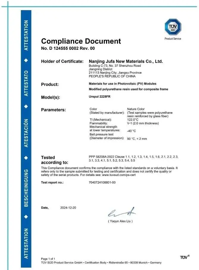 日前,聚发新材脂肪族聚氨酯拉挤树脂顺利通过了【TÜV-SÜD】 权威认证,这一认证过程严格且全面,对产品各项性能指标进行了深度剖析与验证,结果令人瞩目。