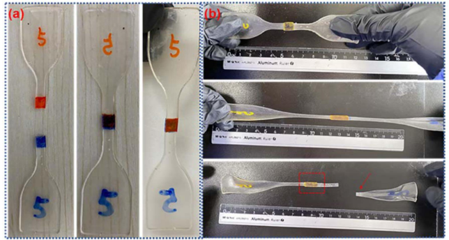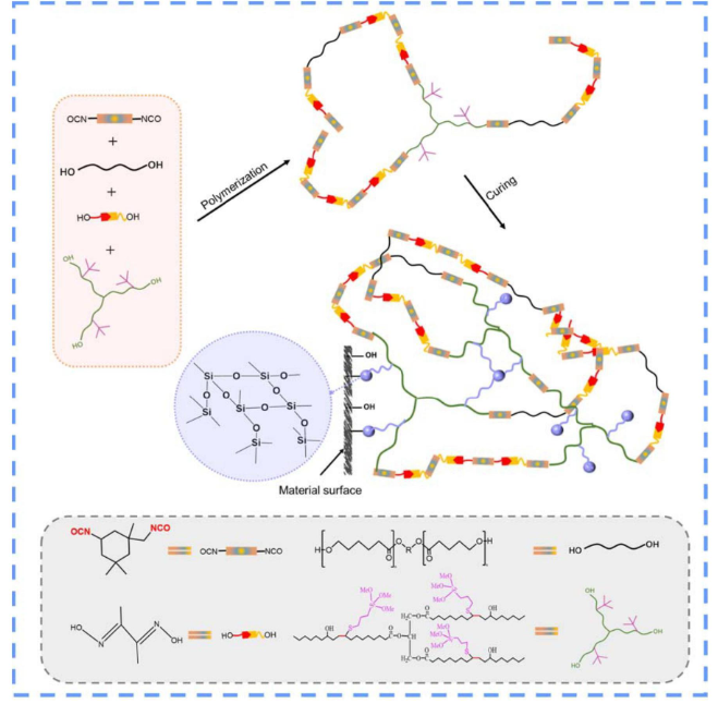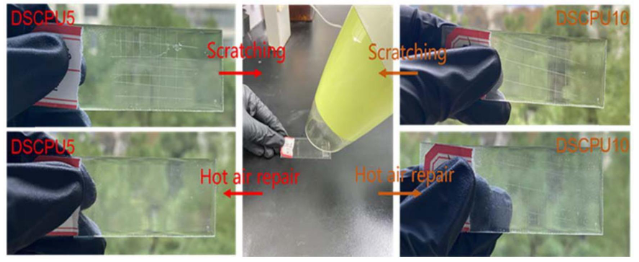 当聚氨酯材料受到损伤,比如出现划痕或者断裂时,这些动态肟 - 氨基甲酸酯键就开始发挥神奇的作用啦。它们可以在室温下发生动态可逆的裂解 - 交换反应,就好比键 “断开” 又重新 “连接”,使得分子链能够在一定程度上自由移动,去填补损伤的部位。就像一群小工人,哪里坏了就去哪里修补,从而让材料实现自修复。从实验中可以看到,像 DSCPU 系列薄膜在室温下放置一段时间后,划痕会变窄甚至消失,这就是动态肟 - 氨基甲酸酯键在起作用,让材料自己慢慢 “愈合” 伤口。