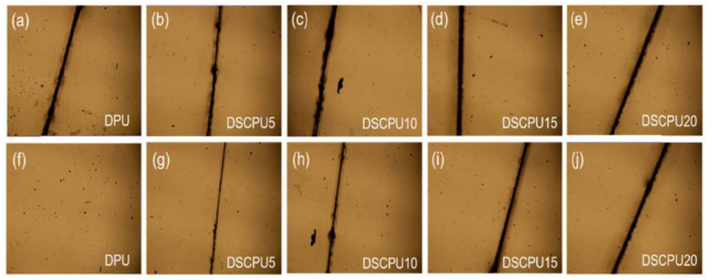 另一方面,蓖麻油基硅烷(SCO)侧链引入的大量硅氧烷基团在成膜过程中发生水解形成硅羟基(Si - OH),进而缩合形成 Si - O - Si 结构,以及在聚氨酯内部形成聚硅氧烷,这就像是在 “骨架” 上又加了一些 “加固件”。这些结构不仅增强了材料的强度,而且在材料受损时,它们也能帮助分子链更好地调整位置,促进自修复过程。例如,从 DSCPU 薄膜的截面修复实验中可以发现,即使薄膜从中间剪断,在一定条件下也能迅速粘合,这就得益于双重交联结构对分子链的作用,让它们在损伤后能够快速重新组合,实现修复。