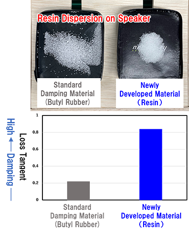 图2:与通用丁基橡胶相比,新型树脂表现出优异的减振性能。例如,与丁基橡胶不同,当应用于扬声器时,它可以有效地抑制声音振动而不会发生位移。