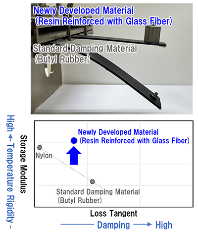 东丽利用其先进技术证明了其损耗角正切(阻尼性能的关键指标)比标准尼龙树脂高约28倍,比丁基橡胶高4倍。这种新材料的热塑性使其适用于包含玻璃纤维和其他添加剂的增强产品。此外,该材料的高温刚性比丁基橡胶高80倍,同时保持了出色的减振性能。