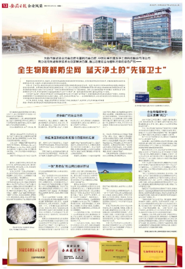 2024年9月30日,《安徽日报》以《全生物降解防尘网 蓝天净土的“先锋卫士”》为题,专题报道了中国化学东华科技在全国率先研发的全生物降解防尘网,旨在解决扬尘污染与“微塑料”治理难题。