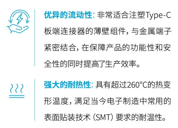 塑料壳体为连接器提供了绝缘保护和机械支撑,对保障产品的功能性和稳定性起到重要作用。随着快速充电、快速传输数据的需求增高,Type-C连接器的功率也不断增大。同时,它的应用场景越发多元,连接器暴露的环境也更加复杂,从而对塑料壳体在高温高湿下的力学性能、电绝缘性能和尺寸稳定性等提出了更高的要求。