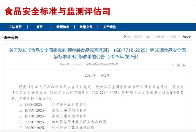 2025年3月27日,国家卫生健康委和国家市场监管总局联合发布2025年第2号公告,新发布50项食品安全国家标准和9项修改单,其中包含5项食品接触材料标准和1项食品接触材料标准修改单。