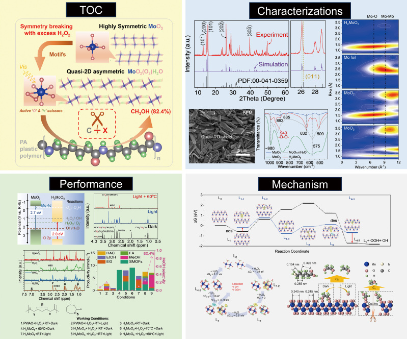 研究团队深耕光催化领域,开发了基于过渡金属过氧化物的水相光催化方法,通过引入过氧化氢(H2O2)调控催化剂的结构,诱导了不对称性的钼-氧(Mo-O)单元的形成,制备出具有准二维片状晶体结构的过氧钼酸(H2MoO5)催化剂。该催化剂与过氧化氢进一步作用形成了高效“假液相”催化体系。在可见光照射下,该催化体系能够生成低碳醇类化合物。同时,催化剂表现出的Lewis酸性,加速了可溶性聚酰胺低聚单体的形成。实验结果显示,在一定条件下,该催化体系能够展现出优异的催化性能。此外,该催化剂还表现出良好的循环使用性能,经过多次反应后仍能保持较高的催化活性。