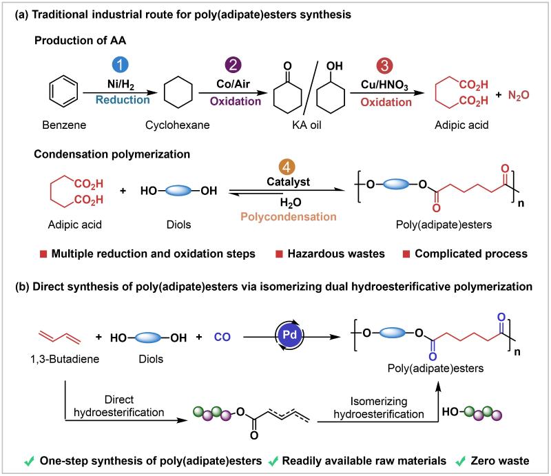 图1. 聚己二酸酯的合成方法:(a) 工业生产路径; (b)本工作发展的新方法