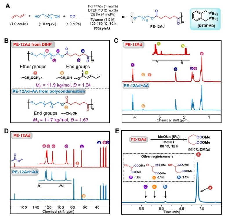 首先,研究团队选用钯和双膦配体催化体系,对聚合条件进行了研究,当使用双膦配体DTBPMB时,反应具有较好的结果。以1, 12-十二烷二醇为单体时,所得聚己二酸十二烷二醇酯产物的数均分子量达到11.9 kg/mol,其中己二酸酯单元的选择性(b/l)大于20/1。核磁表征发现,通过IDHP得到的聚酯,其分子主链与工业上缩聚得到的高分子几乎一致。同时,聚酯的各种热力学性能也与缩聚得到的聚合物相近。