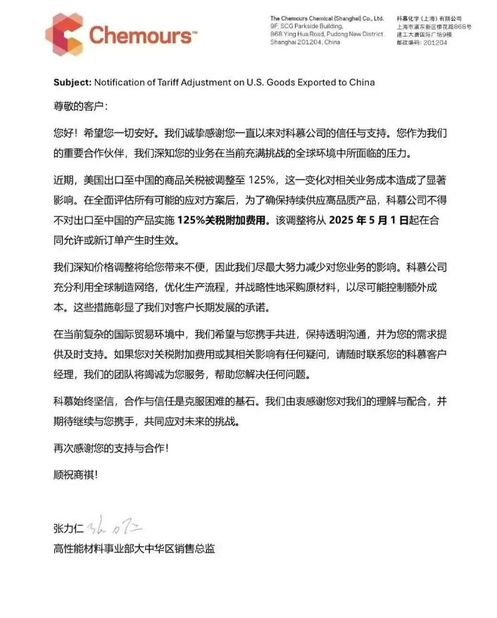 科慕在涨价函中清晰阐明,此番调价的根源在于美国出口至中国商品的关税被大幅调整至 125%。这一突如其来的政策变动,使得科慕相关业务的成本呈几何倍数攀升。在对各类应对方案进行全面、深入的评估后,为了确保能够持续向客户提供高品质的产品与服务,公司最终无奈做出了这一艰难决定。按照计划,此次价格调整将于 2025 年 5 月 1 日起,在合同允许的情形下,或是新订单生成之时正式生效。
