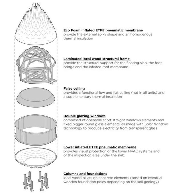 每个单元的屋顶都将通过SPF喷涂的Eco Foam进行充气,Eco Foam本身也是可回收的,并提供隔热和结构刚度。由于该度假村主要用于蓝粘土的处理,因此,ETFE膜也模仿粘土和周围森林的颜色,同时让人联想到该物质的柔软性。层压轻质框架由当地木材制成,将支撑气动顶膜,使其也能承受雪荷载。在冬季,积雪还会聚集在握持的尖刺上,从而增加泡沫的厚度和均匀度,从而进一步使装置隔热。