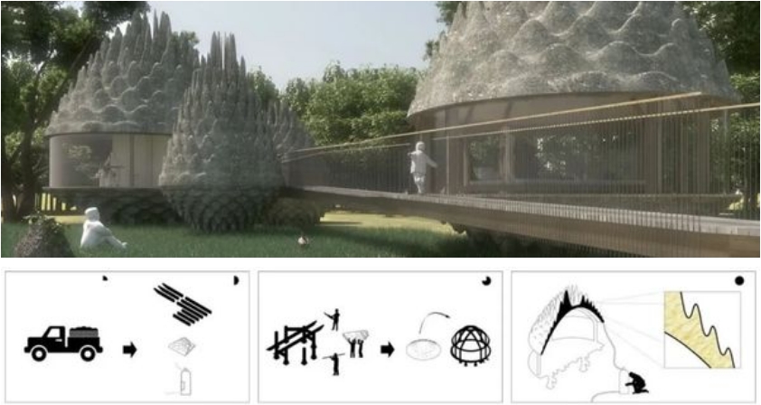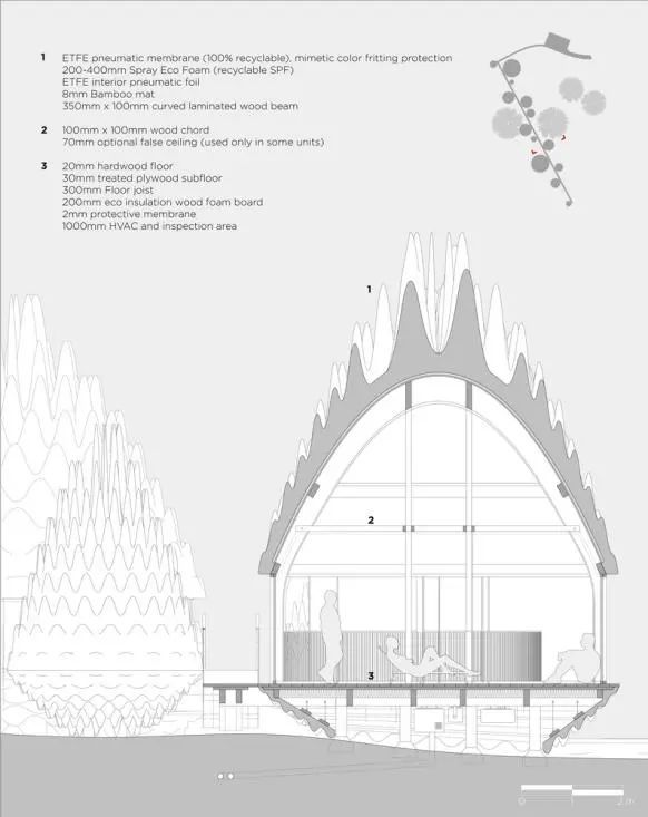 方案旨在拉脱维亚的Kurzeme历史地区建造一个通风的森林度假胜地和水疗中心,通过使用可膨胀的ETFE构成单位屋顶。ETFE是充气屋面中使用最广泛的材料。这种材料是100%可回收的,并且在运输和安装方面具有最小的碳足迹,这种材料具有高度的可持续性,并且在此特定项目的情况下,可提供灵活而动态的建筑形式。