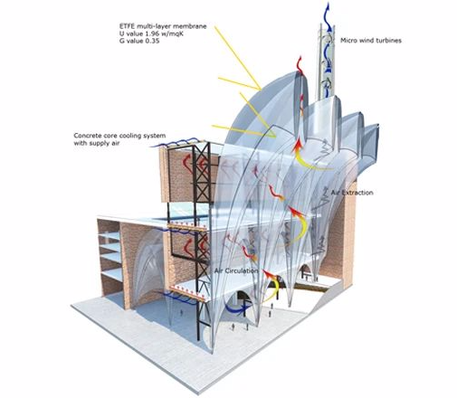 与能源公司Dalkia合作设计的,计划旨在在温室内创建一个稳定的摄氏26度的环境。为了实现这一目标,建筑师采用了结构钢和ETFE塑料技术的结合。该计划将采用60米x 4米的ETFE双穹顶,形成受压的垫层,使紫外线得以通过,同时控制内部的热条件。结构下方的第三层ETFE将积聚温室效应产生的热量,并将其用于热能。这种双重绝缘的圆顶将在夏季保护热带生态系统,并在冬季保持其温度。