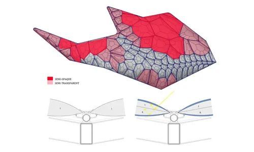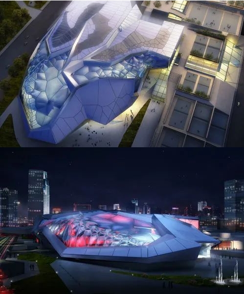 该架构基于自然界中各种规模的晶体图案,采用大型气泡膜窗户,可欣赏公园和城市的景色。窗户的图案散布在建筑物的金属面板外墙上,作为屋顶上的太阳能电池板区域。