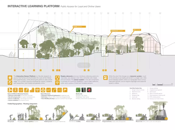 大棚由波士顿肯尼迪·维奥里奇建筑有限公司(Kennedy&Violich Architecture,Ltd .)与韦尔斯利(Wellesley)的跨学科团队合作设计。植物群将以一系列室内景观组成,这些景观以湿生物群落和干生物群落排列,复制了自然条件,包括土壤成分,温度,光照和湿度,这些自然条件在其自然栖息地中维持着多种植物的生长。