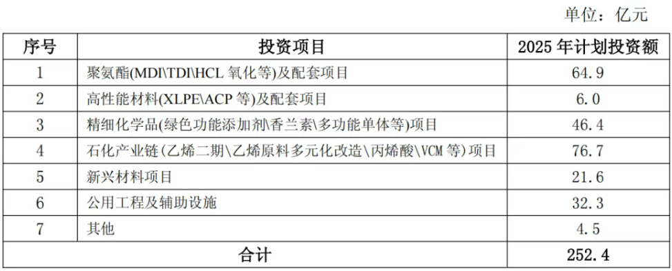 2025年主要项目计划投资252.4亿元。重点建设MDI扩能一体化配套项目,全年聚氨酯及配套项目计划投资64.9亿元;完善石化产业链,重点完成100万吨/年乙烯原料多元化技改及乙烯二期项目建设,全年石化产业链计划投资76.7亿元。加快自主研发的绿色功能添加剂、香兰素、营养品等一系列营养科技产品的工业化建设,全年精细化学品项目计划投资46.4亿元;持续打造公司第二增长曲线,加快磷酸铁锂、PVDF等一系列电池材料等项目建设,全年新兴材料项目计划投资21.6亿元。具体项目投资计划如下: