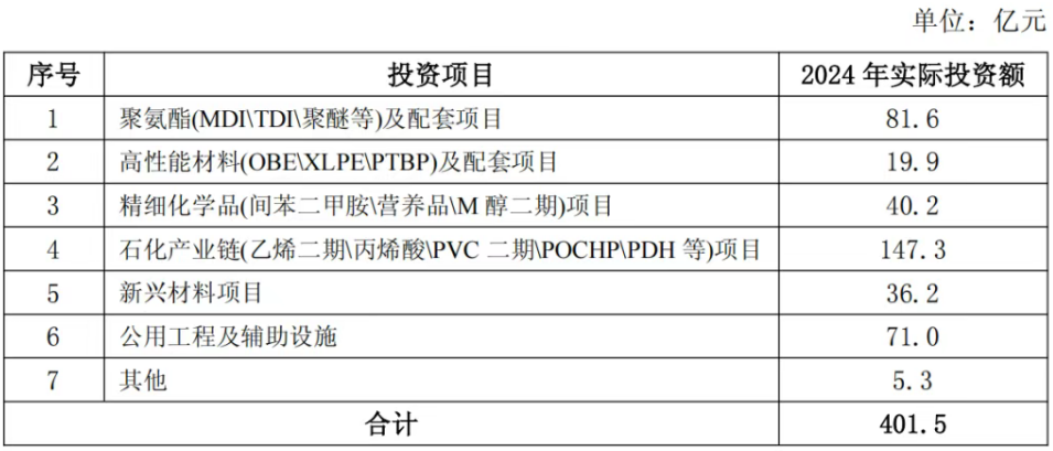2024年实际完成项目投资401.5亿元,主要投资完成情况:聚氨酯及配套项目完成投资81.6亿元,高性能材料及配套项目完成投资19.9亿元,精细化学品项目完成投资40.2亿元,石化产业链项目完成投资147.3亿元,新兴材料项目完成投资36.2亿元,公用工程及辅助设施完成投资71.0亿元,其他项目完成投资5.3亿元。具体投资完成情况如下: