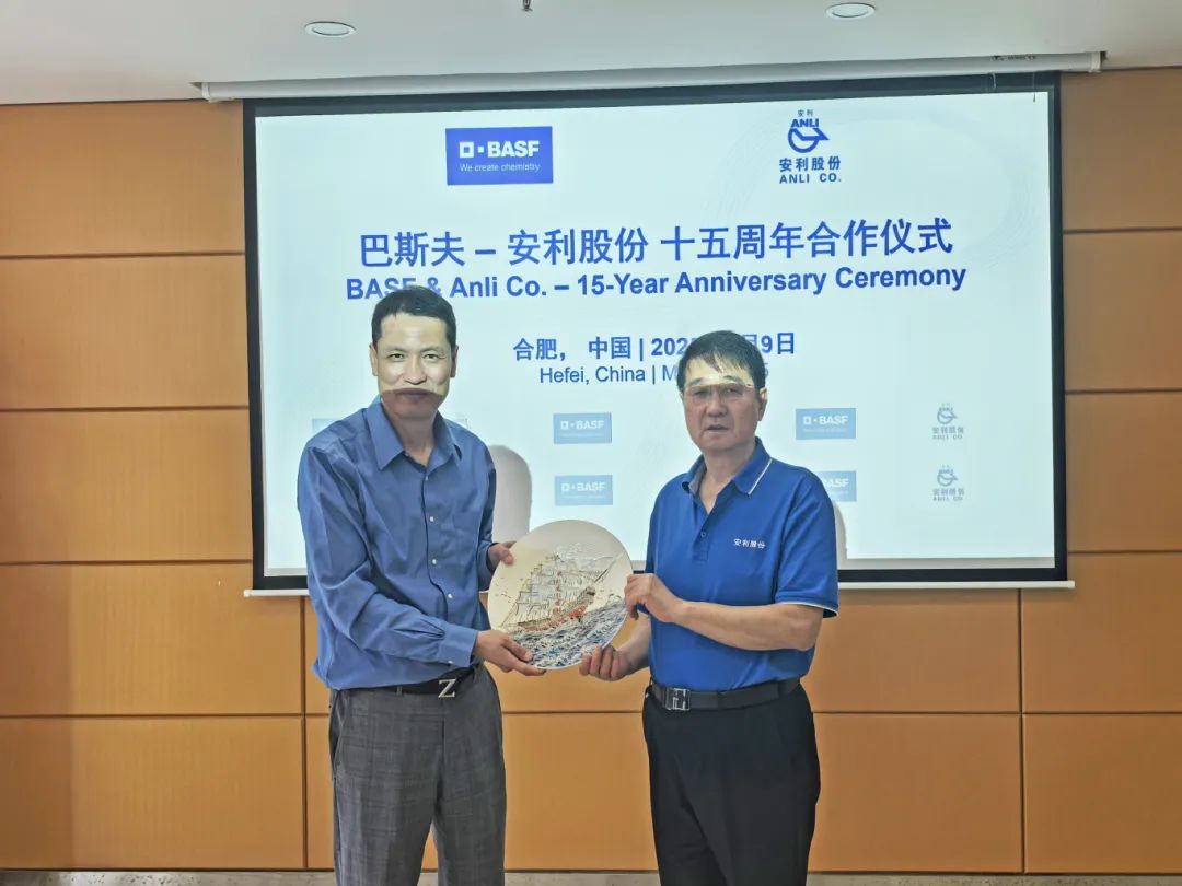 2025年,安利股份与巴斯夫无溶剂聚氨酯合成革开发合作已15周年,会议回顾了双方15年来的合作概况。巴斯夫与安利股份共同开创了无溶剂聚氨酯合成革行业,双方表示将继续深化合作,引领全球行业发展,为全球消费者提供绿色生态的美好材料。会议中,顾丰资深总监代表巴斯夫为安利股份赠送了合作15周年纪念品,祝福安利股份一帆风顺、大展宏图。