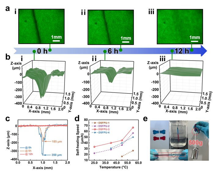 图2 (a)DSFPU-3在水下自愈合过程的偏光显微图像;(b) DSFPU-3在水下自愈合过程的三维激光共聚焦图像;(c) DSFPU-3在水下自愈合不同时间的划痕深度变化;(d) DSFPU在水中不同温度下的自愈合速度;(e) DSFPU-3在水下愈合后可提起500g砝码重量