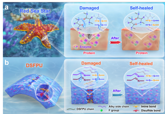图1 (a) 红海星受损后分泌含氢键与动态二硫键的酶,实现水下自愈合;(b) DSFPU通过氟基团与烷基侧链排除水分子干扰,串联型二硫键与亚胺键驱动实现水下自愈合