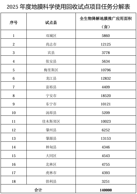 (一)实施范围。保持试点政策连续性,继续选择双城区、尚志市、宾县、依安县、梅里斯区、龙江县、富裕县、宁安市、东宁市、汤原县、佳木斯郊区、肇州县、肇源县、林甸县、大同区、北林区、虎林市、勃利县等18个县(市、区),开展2025年度地膜科学使用回收试点。