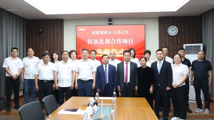 5月28日,道恩集团与江苏汉光实业股份有限公司(简称:江苏汉光)抗氧化剂合作项目签约仪式在道恩集团总部举行。江苏汉光董事长顾法明及其团队;道恩集团董事长、总裁于晓宁,副总裁宋慧东、邱焕玲、王可友、刘丽丽、解云涛,以及有关职能部门负责人出席活动并见证签约仪式。