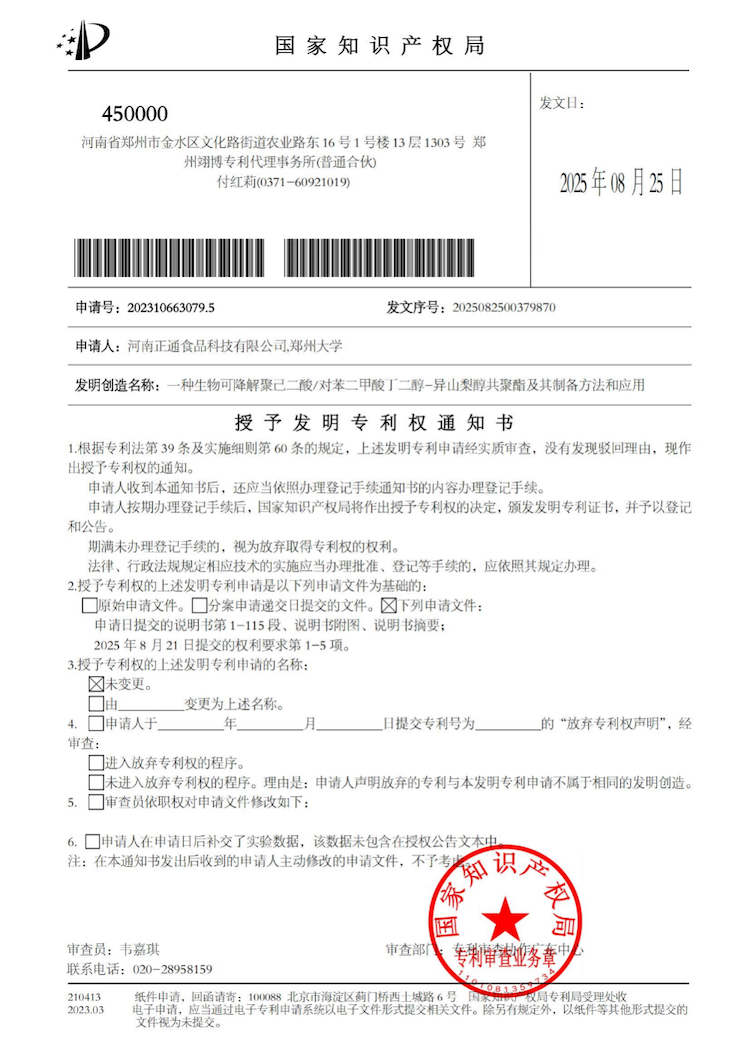 近日,由河南正通食品科技有限公司(简称:正通科技)与郑州大学联合申请的发明专利"一种生物可降解聚己二酸/对苯二甲酸丁二醇 - 异山梨醇共聚酯及其制备方法和应用",正式获得国家知识产权局授权。