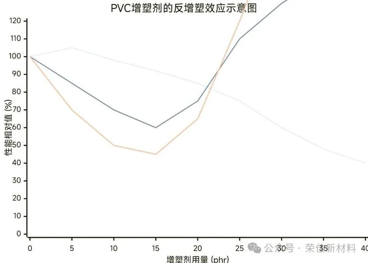 2. 性能预测的关键:理解反增塑效应,才能绘制出完整的PVC性能-增塑剂用量曲线图。这张图并非从原点开始就单调下降,而是会先经历一个驼峰(或凹陷),这才是指导精准配方设计的科学依据。