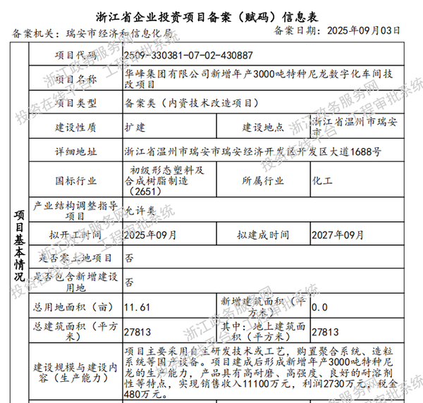 华峰集团有限公司新增年产3000吨特种尼龙数字化车间技改项目通过备案。
