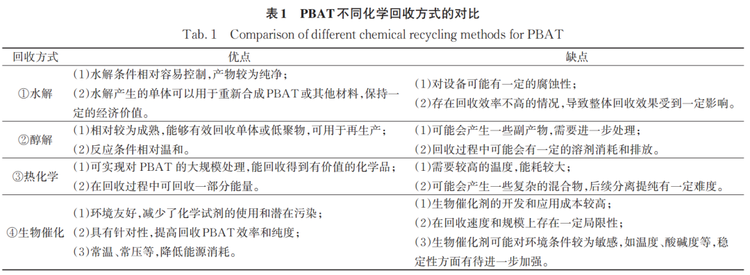 表1总结了PBAT多种化学回收路径的主要优缺点。总体来看,PBAT化学回收技术正快速发展,科研机构和企业持续投入,推动回收工艺向高效、环保和创新方向演进。目前,热解是应用最广的技术,可将PBAT分解为可再利用的化学品,是实现资源循环的重要手段。同时,新兴化学转化工艺不断涌现,如催化转化和溶剂裂解等,可将PBAT制成不同性能的新材料,进一步拓展其循环利用路径。
