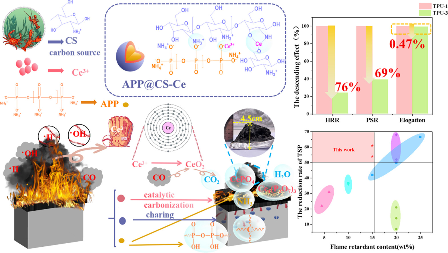 研究发现,仅添加15%的APP@CS-Ce即可使TPU复合材料达到UL-94 V-0等级,极限氧指数(LOI)达27.6%。炭残留量从0.5wt%(纯TPU)飙升至24wt%,而峰值热释放速率(PHRR)和总烟释放量(TSP)分别降低76%和61%。尤为关键的是,一氧化碳释放量减少45%,证实了有效的毒性抑制。铈离子进一步促进了炭层的石墨化并催化CO向CO₂转化,从而增强阻隔性能与燃烧效率。与传统添加剂不同,APP@CS-Ce因界面相容性改善,在保持力学完整性方面表现优异,断裂伸长率仅下降0.5%。该研究展示了一种结合生物质资源与稀土催化的可持续高性能阻燃策略,为新一代TPU应用提供了新途径。