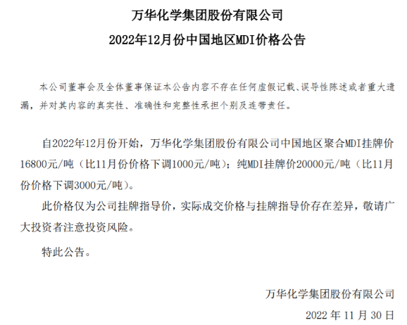 11月30日,万华化学集团股份有限公司宣布下调2022年12月份中国地区MDI价格,其中中国地区聚合MDI挂牌价16800元/吨(比11月份价格下调1000元/吨);纯MDI挂牌价20000元/吨(比11月份价格下调3000元/吨)。纯MDI为2022年以来最低报价,与3月份最高报价26800元/吨相比,降幅达34%。
