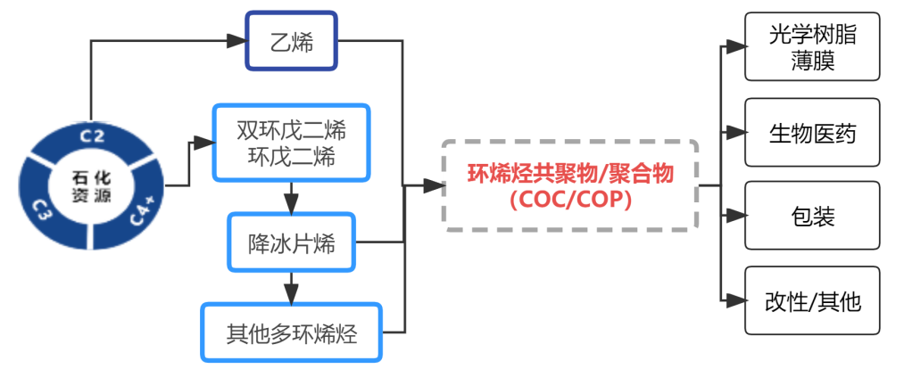 COC是由烯烃与环烯烃单体共聚而成,COP是由环烯烃单体单聚而成。此类聚合物是一类新型的高附加值热塑性工程塑料,其特性曲线在聚合过程中可以在很宽的范围内变化。主要应用集中在光学等高附加值领域。