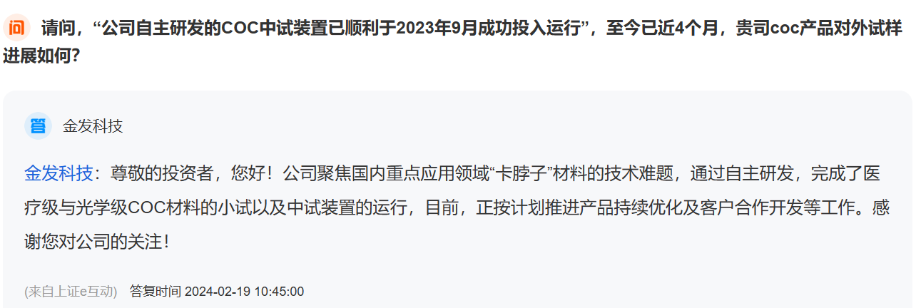 2月19日,金发科技表示,通过自主研发,公司完成了医疗级与光学级COC材料的小试以及中试装置的运行,目前,正按计划推进产品持续优化及客户合作开发等工作。