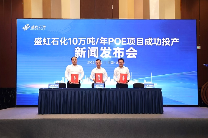 2025年9月4日,盛虹石化10万吨/年POE项目成功投产新闻发布会暨长期供货战略合作签约仪式在江苏连云港举行,首批320吨优等产品同步发车交付。