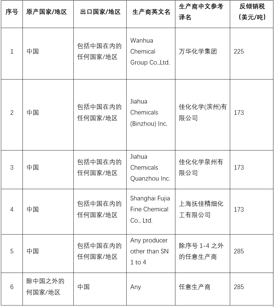 附表:印度对华共聚物多元醇反倾销终裁建议征税表